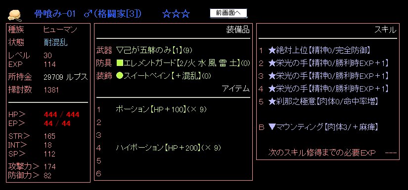 少ない鯖の容量限られた迷宮の広さ登場させれるモンスター数などやりこみゲーの宿命ともいうべき問題の優良な解決方法だったのだろうがやはり「深い階に行くほど敵が強い」モンスターの強さのインフレーションはあくまで階の深度に依存するといういたって単純な大前提が私にとっては大切だったようだ