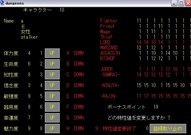とりあえず初期特性値ボーナス14以上HP8以上を目標にASSASSINを三人作ることにする。