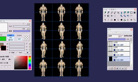 見下ろし視点での次回作を作るなら、普通の移動はさせないつもり(最高速での動作指定で1マス移動するごとウェイトを挟んでブツ切れで移動していく形に演出したいと考えている。レトロっぽい移動万歳)なので正直歩行グラフィックの横列は全部同じ画でも個人的には充分なんだが…