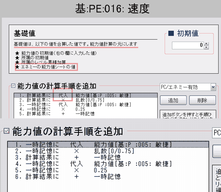 >計算手順をPCに適用するかエネミーに適用するか、あるいは両方かは、手順の右の方にあるボックスから変えられます