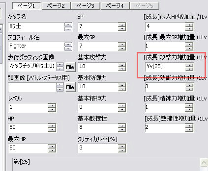 ウルフエディタのサンプルゲームを例にとって書きました。可変DBの各[成長]欄はお好みで0(ゼロ)にするなり変更すると良いと思います。
