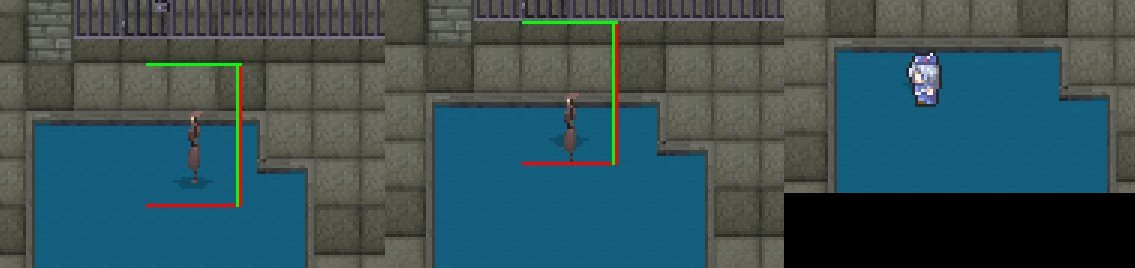 キャラの膝辺りが自キャラの中心となっているため、1マス幅を通行させようとしたとき(つまり扉など)すんなりと通過させにくくなる。