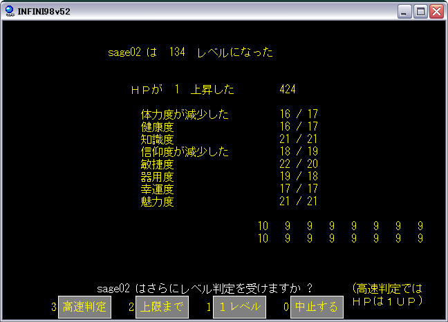 今回数えてみると87回リセット繰り返しても結局特性値下降が止まらなかった。根負けして低下を受け入れたよ(最初の1UPの低下を乗り越えるとその次は現状維持が出るときもある。上昇はほとんど無い。傾向としては圧倒的に体力低下が多い)。
