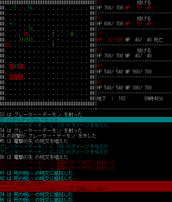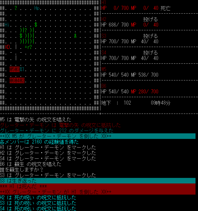 まあとにかくそういうわけでMPが倍になったとはいえ敵の性質によっても効く攻撃魔法が違うなどし、(魔法の場合、物理攻撃と違って前ターンの行動が記録されないため連続で唱えるのがめんどくさいという側面もあるが)弓戦士主体の拙者パーティの場合、基本的には戦うというより常に逃げ回るというスタイルになっているため、階段を見つけて潜るという以外にさしたる選択の余地がなかったという感じである。